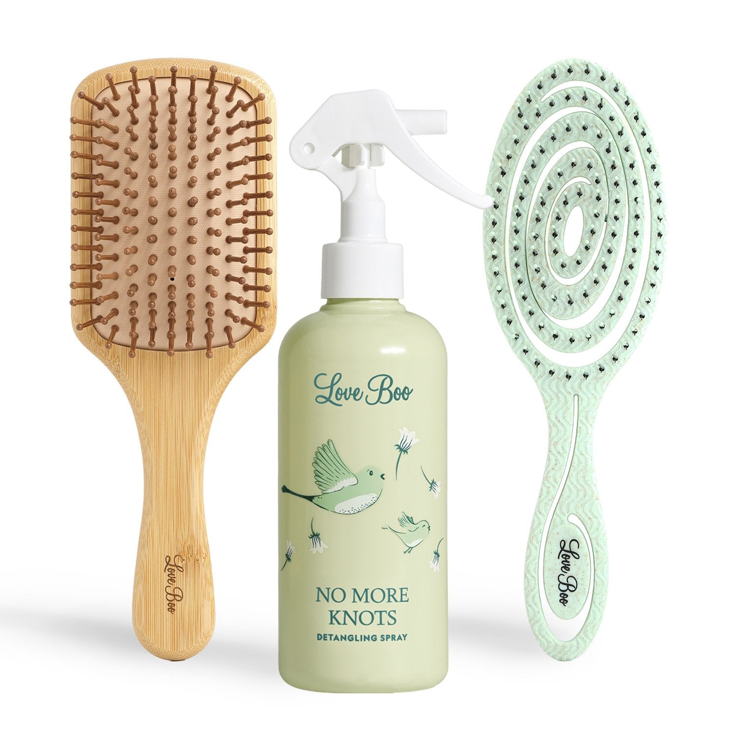 Experience the ultimate hair care bundle with our Love Boo Wooden Brush, No More Knots Detangling Spray, and Detangler Air Comb. The wooden brush features a natural rubber cushion base and a wooden handle with a Carnauba wax finish, all in compostable packaging. Our detangling spray with argan oil, fig, and coconut gently releases knots and calms flyaways while nourishing and hydrating hair. Glide through knots effortlessly with the air-cushioned comb, reducing breakage and leaving hair smooth and soft. Say goodbye to tangles and hello to luxurious hair care with this bundle.